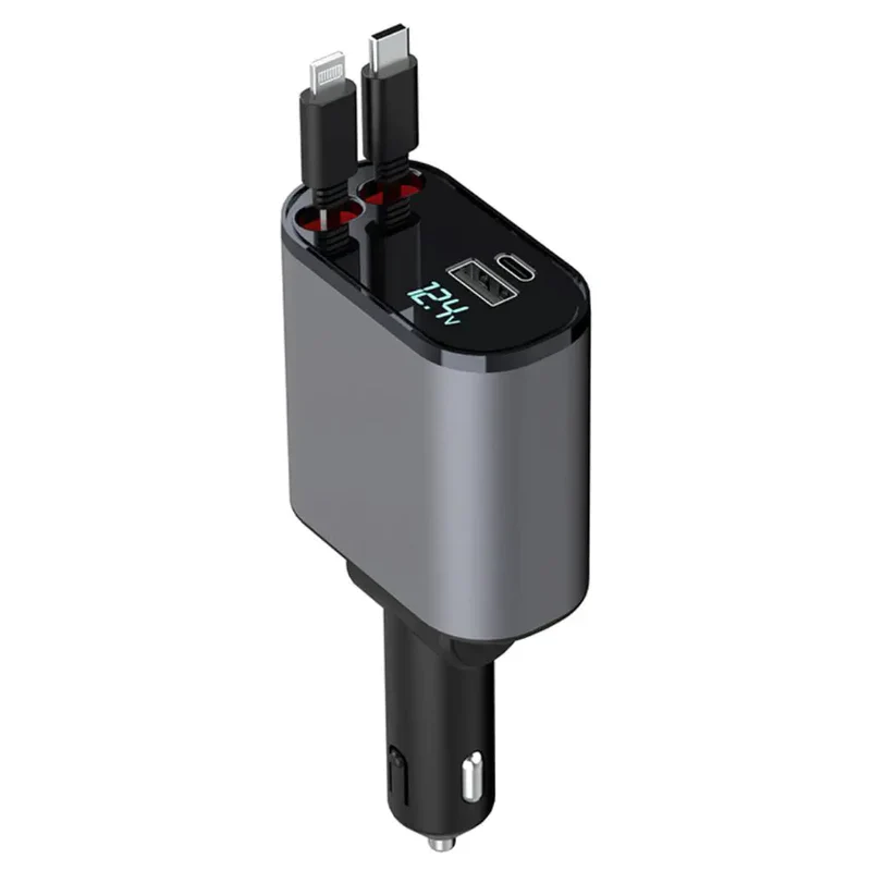 Dive into a seamless charging experience with our car charger that features ingeniously designed retractable cables. Extend or retract with ease, ensuring you get the right length tailored to your needs, every time.